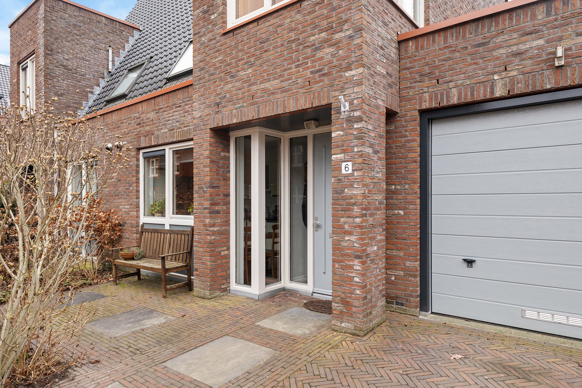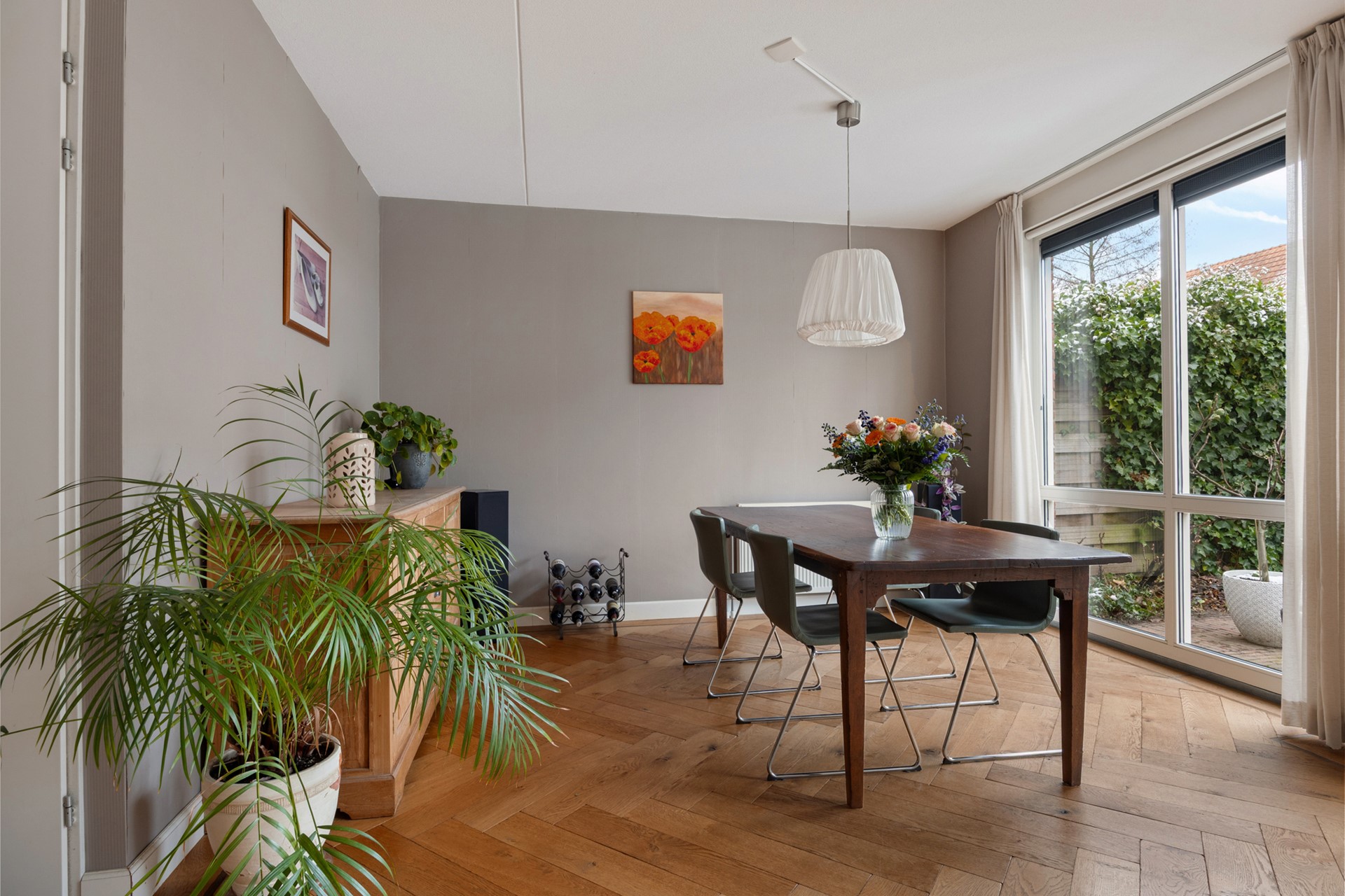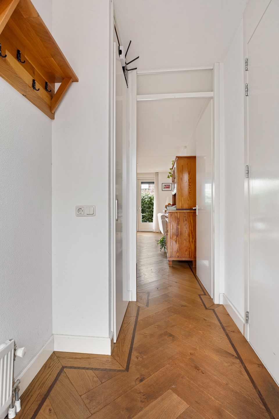The hall provides access to the living room and the indoor garage. This garage is useful as a storage room, bicycle shed or for parking a car. The living room feels spacious and light and has a wooden herringbone floor.
