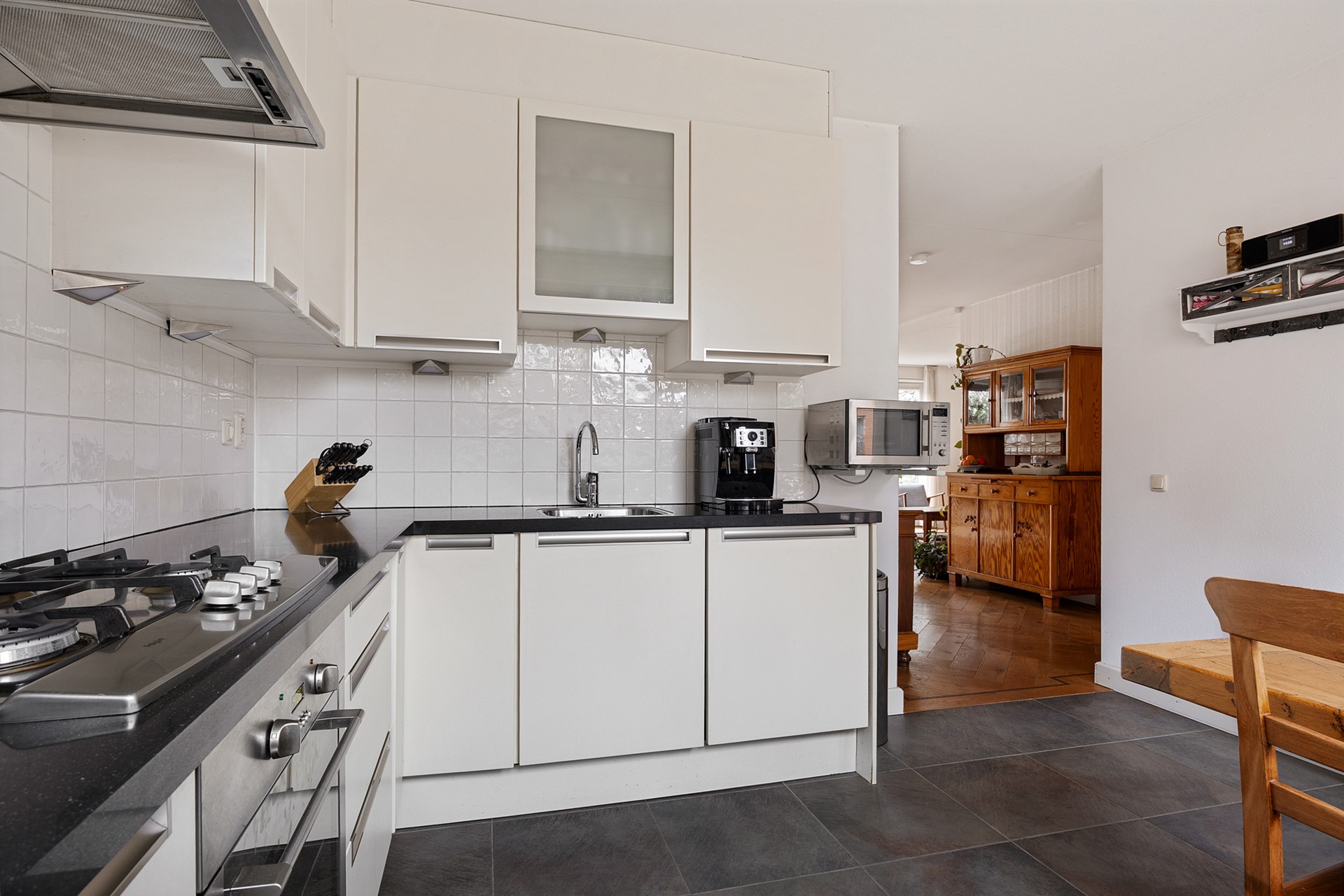 -Moderne keuken van alle gemakken voorzien met een 4-pits gaskookplaat, koel-/vriescombinatie, vaatwasser, oven en magnetron.