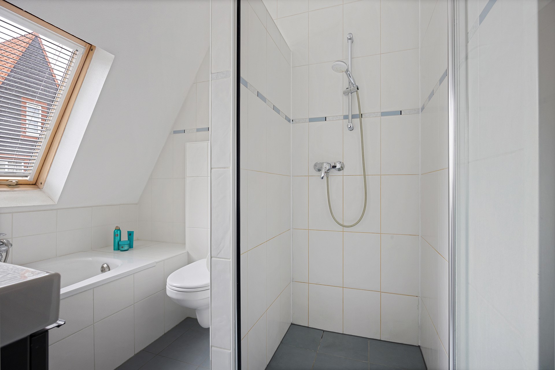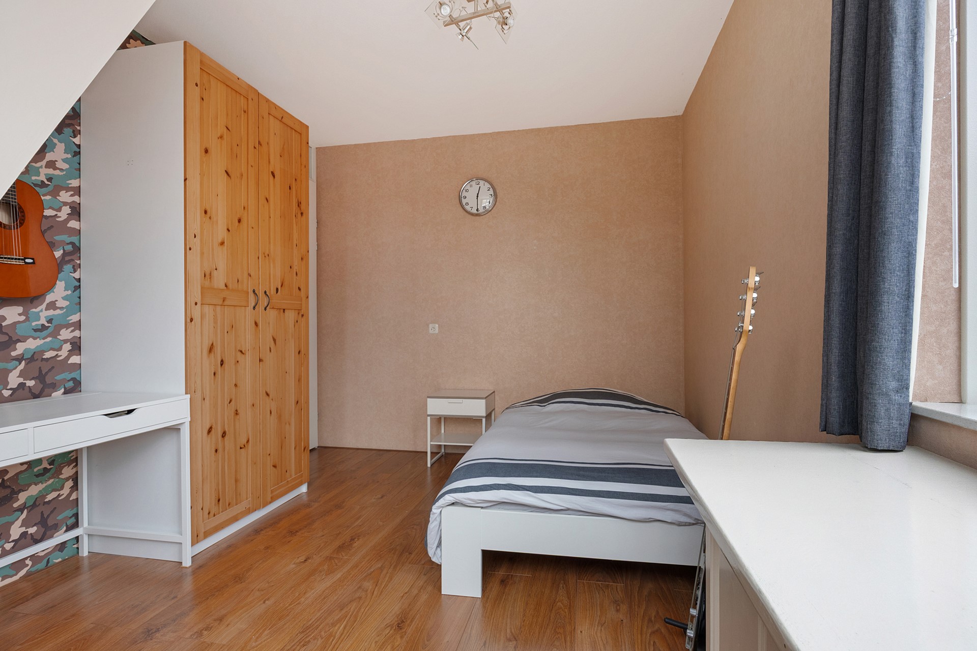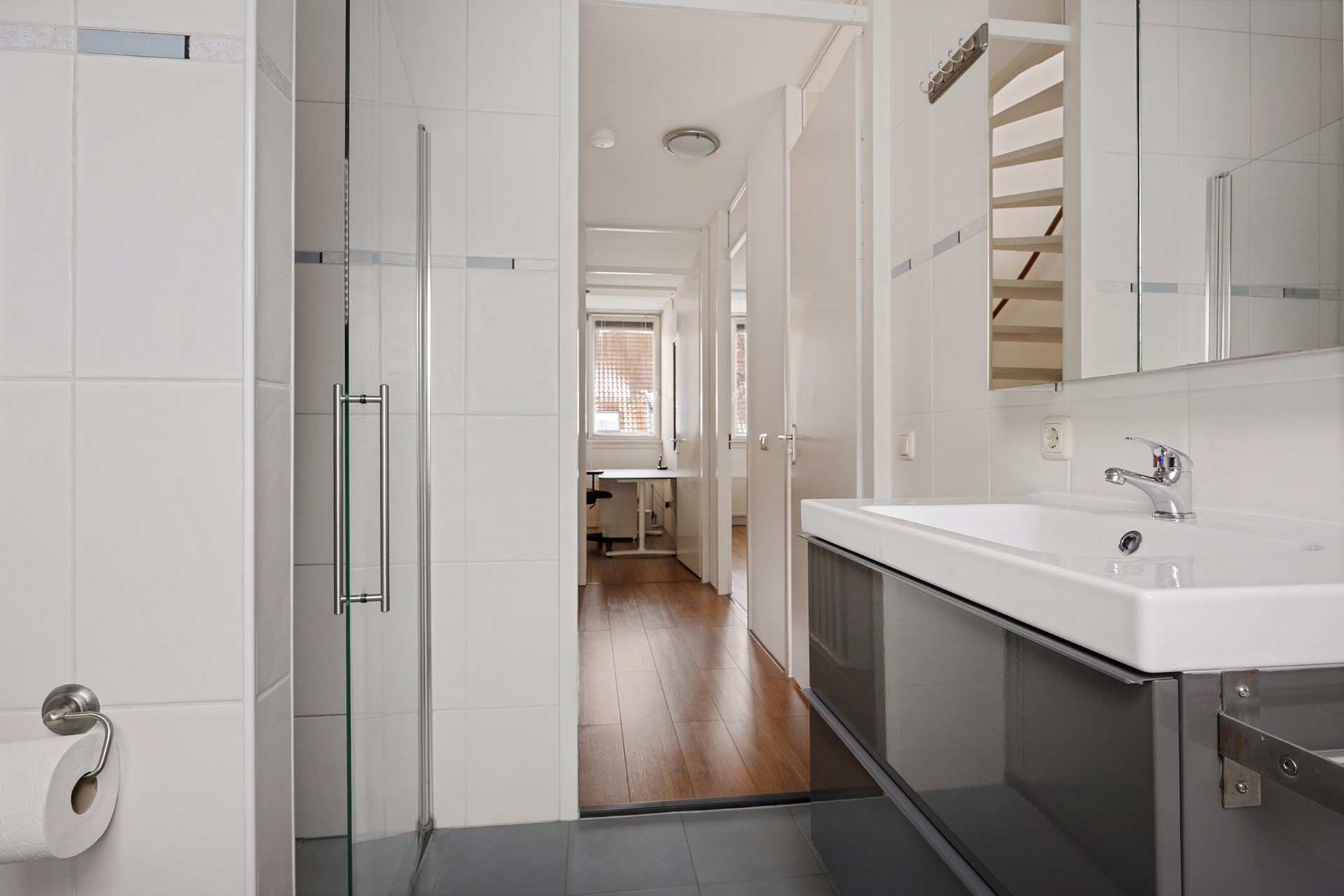 On the first floor, there are three bedrooms and the bathroom. In addition, you will find a stylish, modern bathroom with a bath, walk-in shower, toilet, and washbasin in neutral colours. The entire floor has neat laminate flooring.
